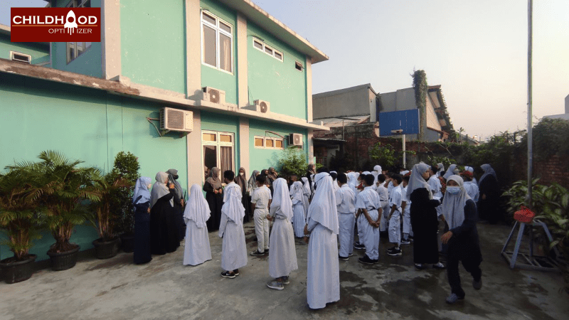Saya naik ojek online bersama Afiqah. Estimasi jam kedatangan di sekolah terus saya intip di layar hp driver ojek. Awalnya dari jam 07.18 WIB (wah, telat 3 menit nih). Lalu saya arahkan driver ojek online untuk berbelok ke jalan tikus. Gang-gang kecil. Lebih cepat karena tidak terjebak macet. Berkurang jadi 07.16, lalu 07.15. Lalu berubah lagi jadi 07.13. Saya senang. Masih belum terlambat. Akhirnya tiba di sekolah jam 07.11 WIB tepat di depan pintu gerbang sekolah dan murid sudah berbaris. Kak Afiqah segera bergabung di barisan murid. Agenda mereka perkenalan dengan guru-guru. Sebuah perasaan senang dan bahagia rasanya melihat proses belajar di sekolah offline. Beda sekali dengan online.