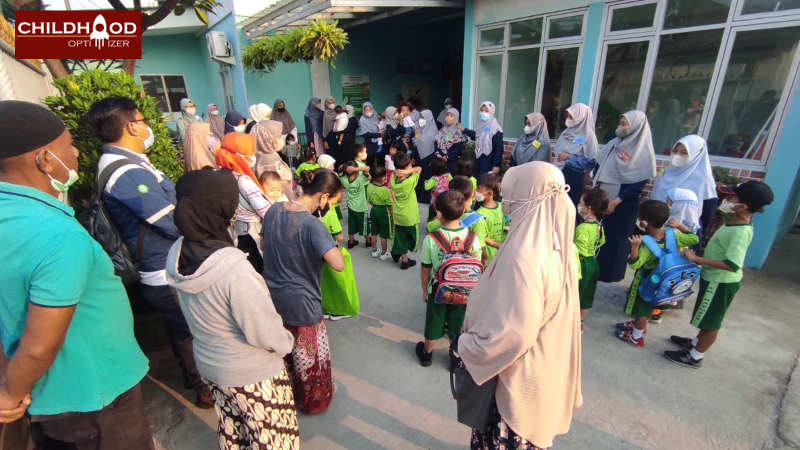 Abrisam kemudian menyusul sekitar jam 07.22. Terlambat 7 menit dari jam masuk seharusnya. Nama Abrisam sudah dipanggil Bu Imas, Kepala Sekolah TK Batutis Al-Ilmi, tapi batang hidungnya belum muncul. Saya tersenyum melihat Bu Imas dari jauh sambil ngobrol dengan suami Bu Imas dari luar pagar.